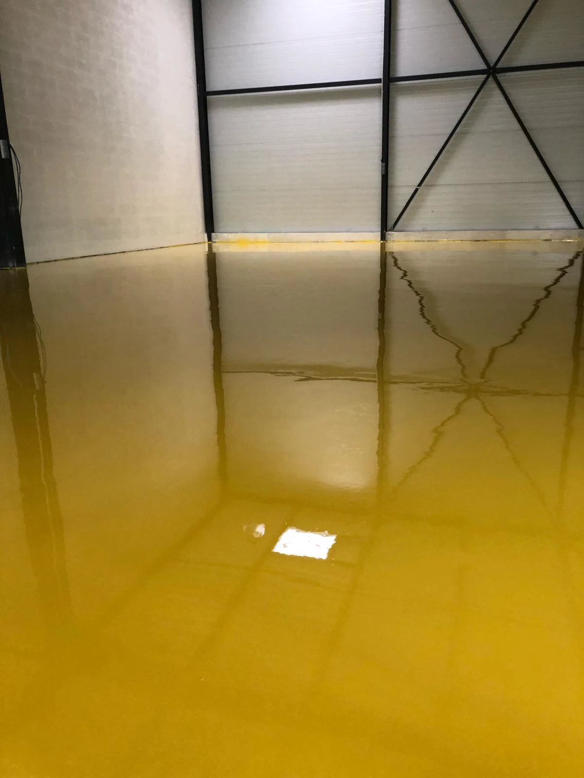 Sol en résine époxy appliqué dans un entrepôt industriel - finition lisse et résistante.